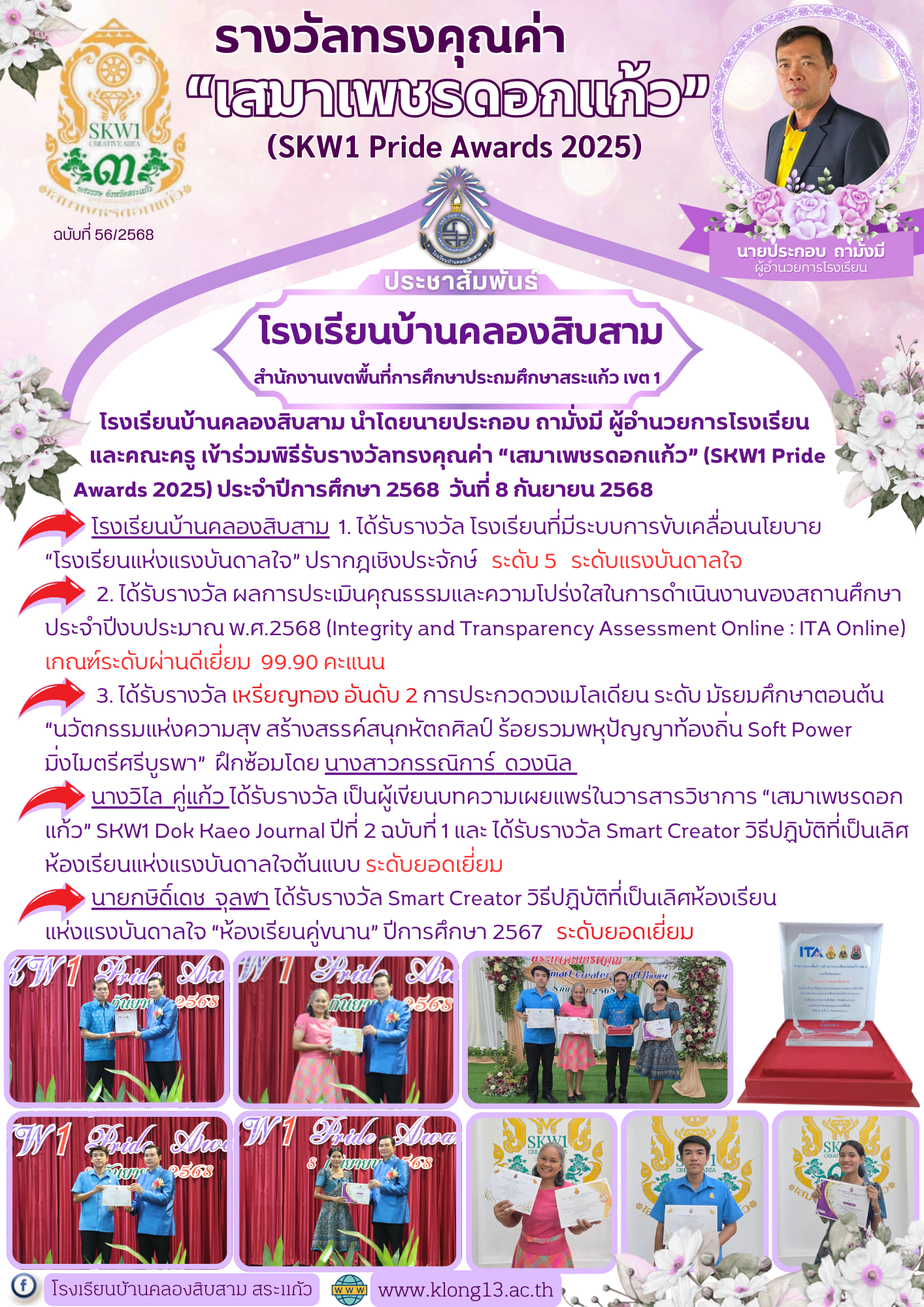 รางวัลทรงคุณค่า “เสมาเพชรดอกแก้ว” (SKW1 Pride Awards 2025) ประจำปีการศึกษา 2568